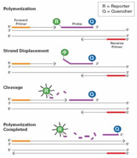 • SYBR green은 PCR로 인해 합성된 이중나선의 DNA에 결합하여 형광을 발하고, TaqMan probe는 5‘ 말단에 형광 물질인 reporter가 붙고 3’ 말단에는 상쇄물질인 quencher가 결합되어 있는 형태로, probe가 주형 DNA에 결합되어 quencher와 떨어졌을 때 형광을 발함.
